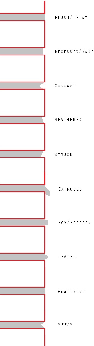 Beyond the choices of mortar colors, there is also a choice in joint style. Not every joint, though, will fit every application. And hands down, concave is the most weather resistant style of mortar joint, making it also the most common tuckpointing style. The picture below outlines each style’s appearance (from a side view), with some prettier than others. Each joint style offers a different amount of weather resistance which goes hand in hand with lifespan. Concave joints are by far the most long-lasting, cost-effective joint. Most of the other tuckpointing styles are seen few and far between, usually on decorative brick or stone work, offered for aesthetics only.
