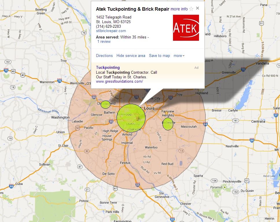 Well, not that far, really… Our Company’s general service area is “The Greater St. Louis Area” but a lot of our work can be found in specific areas and neighborhoods. How specific? Pretty specific. Why? Many of the areas below are primarily contain older brick homes in need of tuckpointing & referral based customers account for more than 50% of our clientage. Our clients tell others, namely neighbors, how we perform, and the finished product speaks for itself as well. There are many areas in and around St. louis where we have addressed multiple houses on one street.