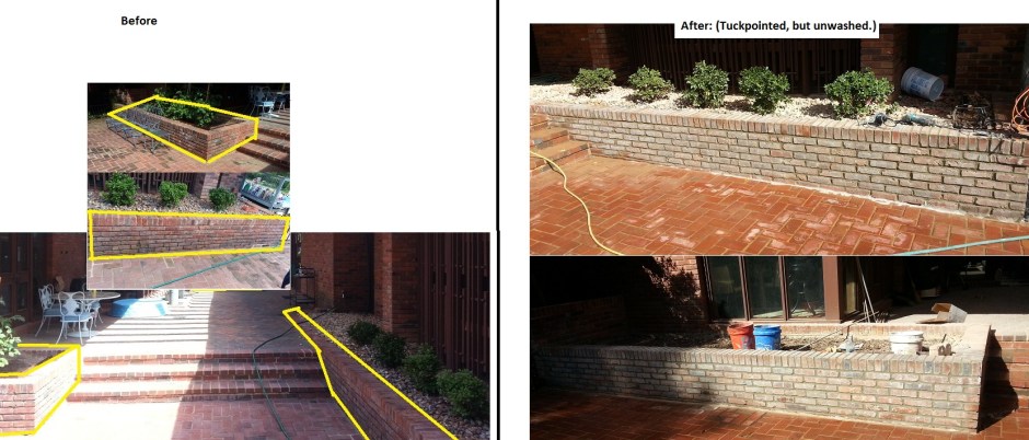 Garden Brick retaining wall before and after tuckpointing unwashed ← Previous Next → Before and After tuckpointing