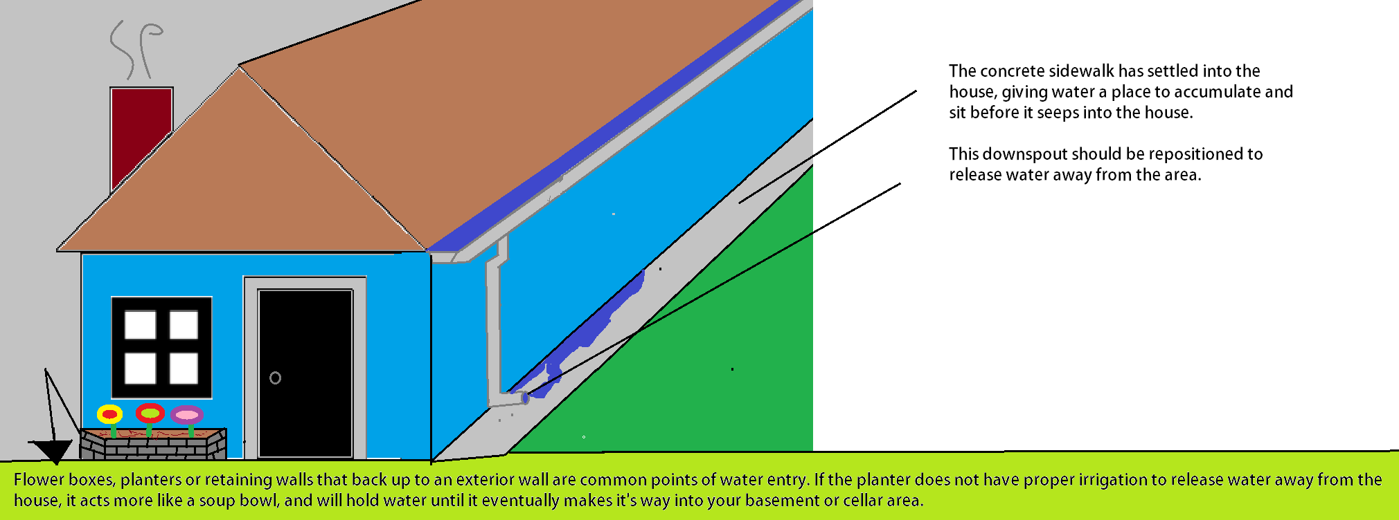 The image above illustrates the 3 of the most common basement water entry points we deal with. (Please forgive the crudeness, I am a masonry contractor, not an artist)